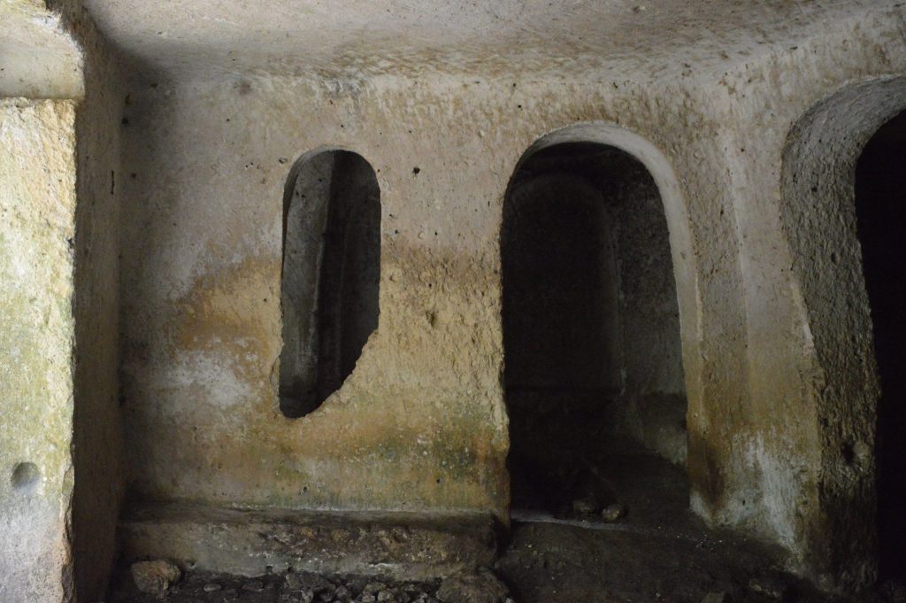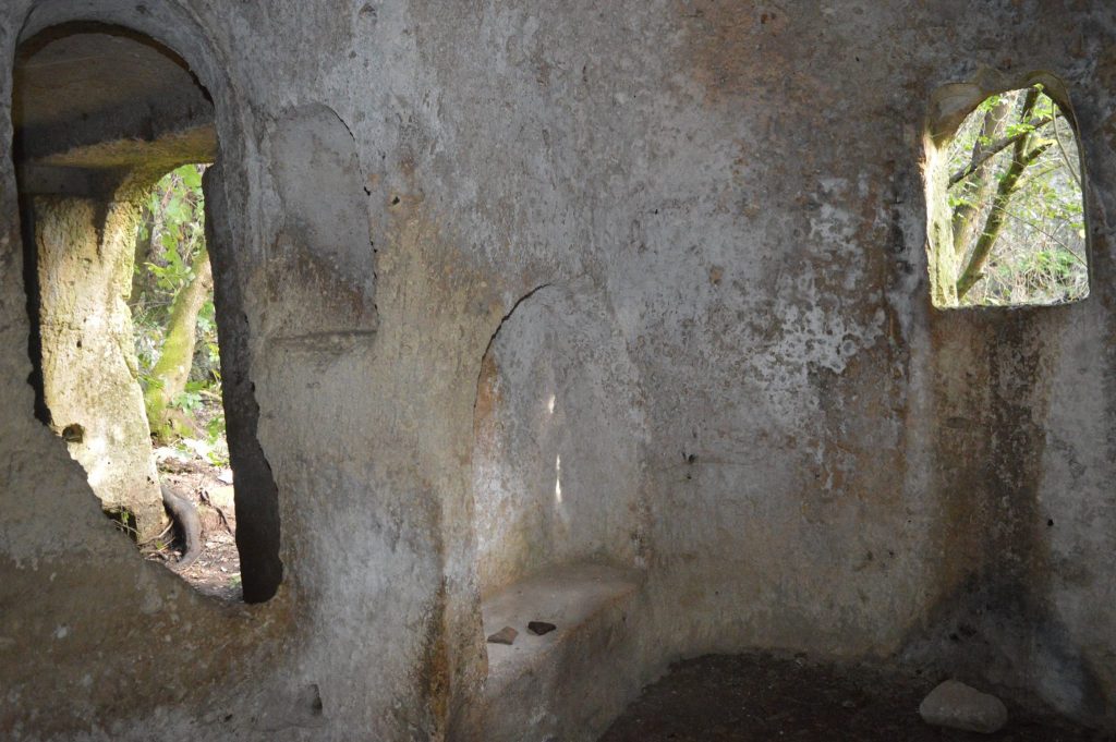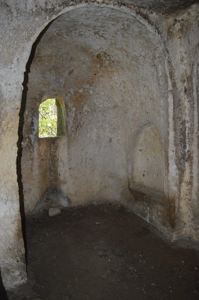 Nel perimetro interno della chiesa sono intercalate varie arcatelle cieche: tre nella cella d’ingresso di cui una mai completata e due nell’aula presbiteriale. Altre due, scavate nei lati dell’abside potrebbero aver avuto le funzioni di diaconico e protesi . Il diaframma tra ambiente d’ingresso ed aula liturgica, in parte delimitato da un sedile perimetrale, è aperto da due arcate di cui una invalicabile e l’altra comunicante con il presbiterio tramite un gradino. Un’altra arcata, in asse con l’abside e con alla base un sedile parallelo all’unica sepoltura finora visibile, è aperta nel diaframma che separa l’aula liturgica dalla terza cella, un ambiente che nella sua forma irregolare denuncia uno scavo probabilmente mai completato. Tutti gli ambienti, tranne l’abside, sono coperti da soffitti piani.