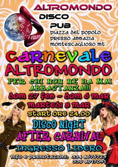 AFTER CARNIVAL @ALTROMONDO DISCO PUB Creato da RAVILO Data:22 Febbraio 2011 in: Eventi Lascia un Commento 1285 Visualizzazioni Montescaglioso