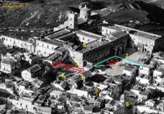 1. Frecce rosse: entrata di tre gallerie di accesso ai seminterrati utilizzati dai monaci per il trasporto di derrate e attualmente sepolte dalle macerie prodotte fino agli inizi anni ’70.