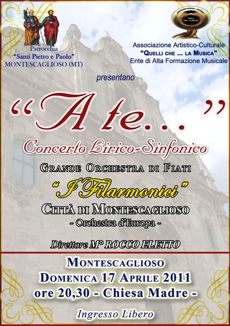 ore 20,30: in Chiesa Madre, Concerto augurale “A te …”, della Grande Orchestra di Fiati “I FILARMONICI” Città di Montescaglioso (MT) -Orchestra d’Europa- diretta dal M° Rocco Eletto.