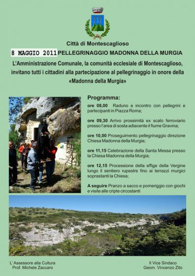 Da secoli la comunità di Montescaglioso, il 1° maggio, dedica alla Madonna della Murgia il pellegrinaggio presso l’omonima chiesa rupestre.