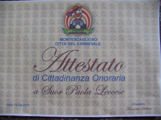 Suor Paola Leccese è stata ringraziata pubblicamente per il suo operato che può essere solo motivo di orgoglio per noi montesi. Simbolicamente Vanessa Leccese (nipote di suor Paola) ha ritirato da parte dell’associazione Carnevale Montese rappresentata da Betty Salluce, una targa in segno di stima, affetto e riconoscimento da parte di tutta la comunità, ribattezzandola montese DOC e dandole cittadinanza onoraria.