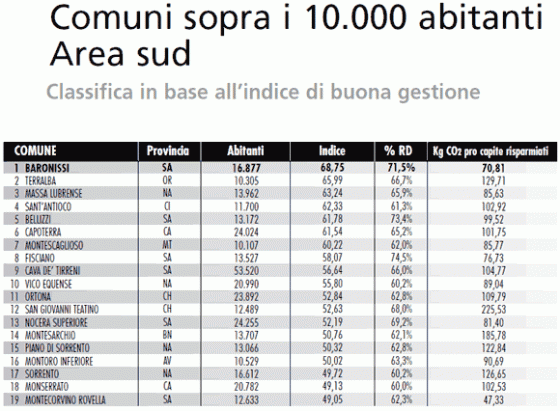 Nel 2010 eravamo secondi nella stessa classifica con una percentuale di differenziata del 65,3% e un indice di buona gestione del 69,04. Stiamo calando ma, tutto sommato, i risultati sono ancora ottimi. Speriamo che il calo sia fisiologico e che questa classifica continui a vederci protagonisti anche nei prossimi anni.
