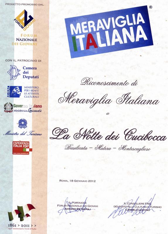 Il CUCIBOCCA ha ricevuto un riconoscimento nazionale come una delle MERAVIGLIE ITALIANE, un progetto realizzato dal FORUM NAZIONALE DEI GIOVANI nell’ambito delle iniziative organizzate per il 150° Anniversario dell’Unità d’Italia. La segnalazione dell’evento di Montescaglioso comprendeva tutti i riti, le tradizioni ed i monumenti del paese e tra questi la Commissione esaminatrice del Forum ha inteso individuare per la sua unicità il Cucibocca come una delle 1000 meraviglie d’Italia. Questa mattina (18 Gennaio 2012) nella Sala Consiliare della Provincia di Potenza i responsabili nazionali del Forum hanno consegnato il riconoscimento a Montescaglioso e agli altri comuni della Basilicata interessati dall’iniziativa. Hanno ritirato il riconoscimento, l’Assessore Roberto Venezia in rappresentanza del Comune e gli operatori del CEA per il gruppo che organizza l’evento. La promozione degli eventi e dei siti interessati dal progetto proseguirà con altre manifestazioni tra cui una presentazione nazionale a Roma nel prossimo mese di Maggio e una vetrina web costituita da un apposito portale ove gli utenti potranno anche votare la MERAVIGLIA ritenuta più interessante. Il Cucibocca 2012 è stato organizzato dal Centro di Educazione Ambientale di Montescaglioso (CooperAttiva) con Città di Motescaglioso, Parco della Murgia Materana, Le Famiglie Risorsa, Croce Rossa Italiana (Gruppo Femminile Montescaglioso) e Programma EPOS del Dipartimento Ambiente della Regione che ha permesso quest’anno di potenziare ulteriormente la manifestazione. Ma ancora una volta un grande grazie a quanti si sono impegnati per la buona riuscita della serata : vecchi e nuovi Cucibocca che hanno permesso di mantenere alla grande la tradizione.