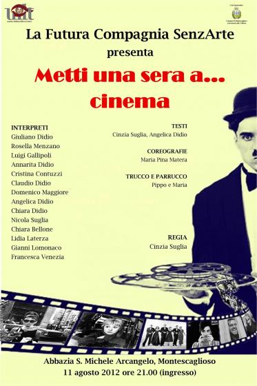 Una scommessa: per chi l’ha pensato e scritto; per chi recita; per chi – per la prima volta – calca le scene con la Futura Compagnia SenzArte; per chi ha pensato ai costumi, alle musiche e coreografie, alla scenografia; per chi “ci vediamo domani mattina alle 11”; per chi non ha tempo, ma lo trova ugualmente; per chi per la FCSA ha dato l’anima, il cuore e anche un po’ di fegato; per chi ama il cinema, tanto da volerlo portare a teatro; per il nostro pubblico, affezionato e sempre attento che – ci auguriamo – vorrà lasciarsi guidare nell’atmosfera sospesa di un’illusione, di un palco che si trasformerà in un improvviso set cinematografico.