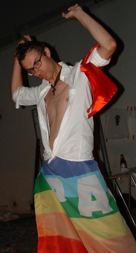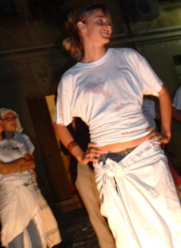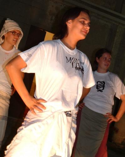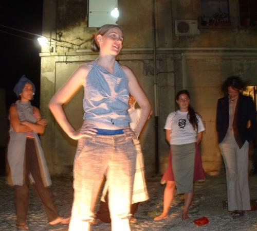 Circa 100 magliette sono serigrafate con elementi grafici rinvenienti dalla rilettura dei segni identificanti della comunità locale. A lavoro terminata la presentazione al pubblico è realizzata con un’intera serata dedicata ad una vera e propria sfilata di moda. Dal laboratorio di sartoria prende avvio il “ corteo “ ( love parade ) con i nuovi abiti e t-shirt, preceduto da giocolieri di strada. Nella piazzetta antistante il serbatoio dell’Acquedotto Pugliese, sfilano modelli/e con i nuovi abiti che vengono anche esposti al pubblico. E’organizzata un’asta per vendere ( con grande successo ) i pezzi realizzati. Tra le “ griffes “ realizzate particolarmente originali alcune magliette con lo stemma dell’Abbazia ( la “ A “ cerchiata con sull’apice la croce ) usata come un graffito da strada; un’altra maglietta con la cornucopia ripresa dal pozzo dell’abbazia; una t-shirt con un elemento grafico che rinviene dallo stemma della famiglia Contuzzi; un vestito realizzato avendo come modello i costumi di Carnevalone. Infine un’altra t-shirt (croccante) sulle festività di S. Rocco nella quale appare il cavallino della Ferrari con la testa mozzata. Il perchè di questa scelta: nelle interviste realizzate i ragazzi hanno scoperto che spesso i cavalli da tiro utilizzati per il carro trionfale finiscono in macelleria, cosa ha ovviamente lasciato molti con l’amaro in bocca.