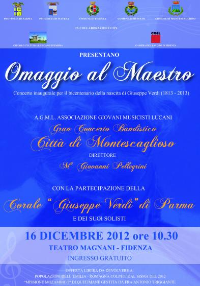 La comunità lucana di Fidenza, in collaborazione con il Gran Concerto Bandistico “Città di Montescaglioso” e la fattiva partecipazione delle Amministrazioni Comunali di Fidenza e Montescaglioso, offrono alle Terre Verdiane il concerto di inaugurazione del bicentenario della nascita del Maestro Giuseppe Verdi. Domenica 16 dicembre 2012 ore 10,45- Teatro Magnani-Fidenza (PR). Il concerto sarà ad ingresso libero con offerte volontarie che saranno devolute per la ricostruzione delle zone danneggiate dal sisma del 20 maggio u.s. in Emilia Romagna