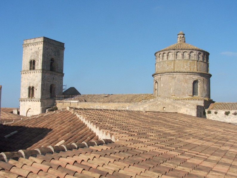 I monaci si erano insediati a Montescaglioso intorno alla metà del sec. XI utilizzando una piccola chiesa forse preesistente o costruendone una sul sito dell’acropoli della città indigena. L’appoggio della feudalità normanna e la donazione di chiese e feudi nel territorio con le relative rendite aveva permesso alla comunità di raggiungere in pochi decenni una notevole ricchezza. Era stato possibile, quindi, ampliare le fabbriche monastiche e soprattutto erigere una nuova grande chiesa adeguata alla dimensione della comunità ed alle consuetudini liturgiche codificate dalla Regola e dalle tradizioni benedettine. La costruzione era stata avviata probabilmente dall’abate Simeone (1078 – 1099) che però era morto pochi mesi prima della consacrazione effettuata sotto il governo dell’abate Crescenzo (1099 – 1119). La chiesa, completata nel 1099, sostituiva una chiesa più antica della quale finora non si sono rintracciate resti e che non si può escludere fosse preesistente all’arrivo dei Benedettini. La chiesa normanna, sull’esempio di analoghi edifici lucani coevi appartenenti ad altri monasteri benedettini (S. Maria di Banzi, S. Eustacchio a Matera, S. Maria del Plano a Calvello e S. Maria del Casale a Pisticci) doveva essere a tre navate absidate precedute da un transetto sul modello della grande abbaziale eretta pochi decenni prima dall’abate Desiderio a Montecassino divenuta ben presto modello per le più importanti comunità monastiche italiane. La chiesa normanna era probabilmente preceduta da un nartece e in prossimità dell’ingresso aveva il campanile.