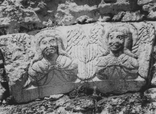 Foto b/n. S. Maria del Vetrano: bassorilievo (inizio sec. XIII) dei cosiddetti ” Fratelli Macabeo “, trafugato nel 1984.