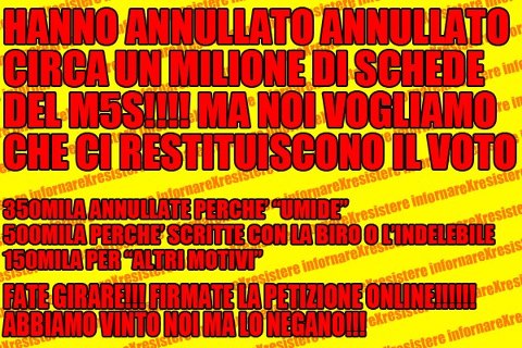 Su facebook gira la voce che siano state annullate 1.000.000 di schede del movimento cinque stelle per motivi “lascio a voli la considerazione” basta aprie il file allegato e lo vedrete. ABBIAMO VINTO !!