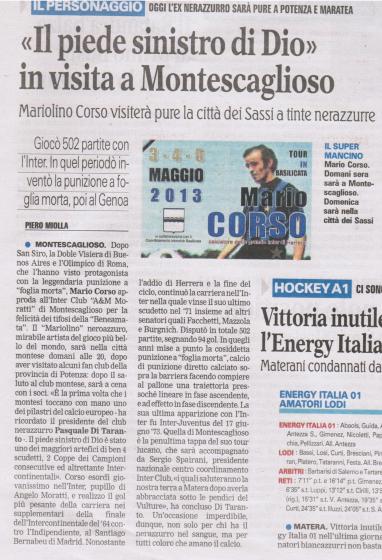 Quella di Montescaglioso è la Penultima tappa del tour lucano di Mario Corso , accompagnato dal Dott. Sergio Spairani (presidente nazionale centro coordinamento Inter Club), i quali saluteranno la nostra terra a Matera dopo averla abbracciata sotto le pendici del Vulture.