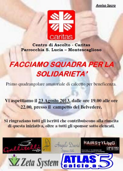 La Caritas parrocchiale di Montescaglioso organizza, con la collaborazione di alcuni volontari esterni, il primo quadrangolare amatoriale di calcetto per beneficenza. Il torneo si svolgerà il giorno 23 Agosto 2013, dalle ore 19.00 alle ore 22.00, presso il campetto del Belvedere.