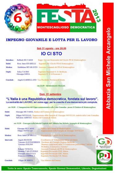 Festa Democratica 2013 Creato da CEA Data:30 Agosto 2013 in: Eventi Lascia un Commento 1347 Visualizzazioni Montescaglioso 6 FESTA MONTESCAGLIOSO DEMOCRATICA 2013 IMPEGNO GIOVANILE E LOTTA PER IL LAVORO
