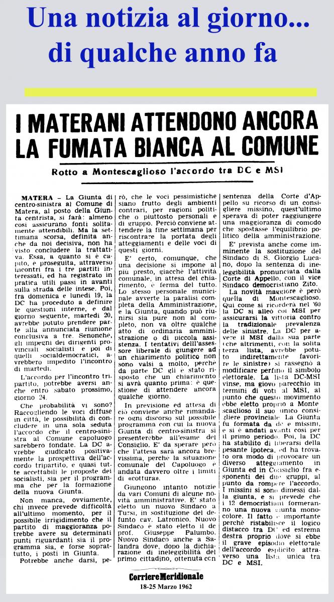 Inizia da oggi la pubblicazione di articoli riguardanti Montescaglioso apparsi negli anni su quotidiani e riviste locali e nazionali. Ogni giorno avrà il suo corrispondente in un anno qualsiasi. La redazione di Montescaglioso punto net provvederà, in seguito, a conservarlo, costituendo una enorme banca dati in cui tutti noi potremo ritrovare la notizia che più ci riguarda. Sperando che l’iniziativa sia di gradimento, si augura a tutti una buona lettura.