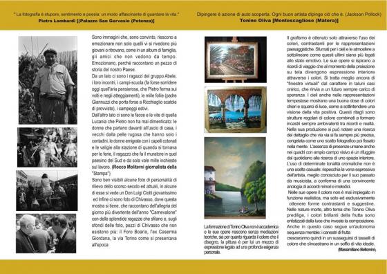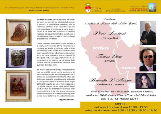 L’associazione Lucana di Chivasso “Giuseppe Novello” nell’intento di promuovere la Basilicata, organizza per il periodo 4 aprile – 13 aprile, una mostra di artisti lucani: Pietro Lombardi: nel campo della fotografia; Tonino Oliva: nel campo della pittura; Brunella D’Adamo: nel campo dell’incisione su rame. La mostra sarà inaugurata il 4 aprile, alle ore 17,30 presso i locali dell’ex biblioteca alla presenza del Sindaco di Chivasso Libero Ciuffreda, dell’Assessore alla Cultura Giulia Mazzoli e del (credo ex) Vice Presidente della Regione Piemonte Roberto Placido.