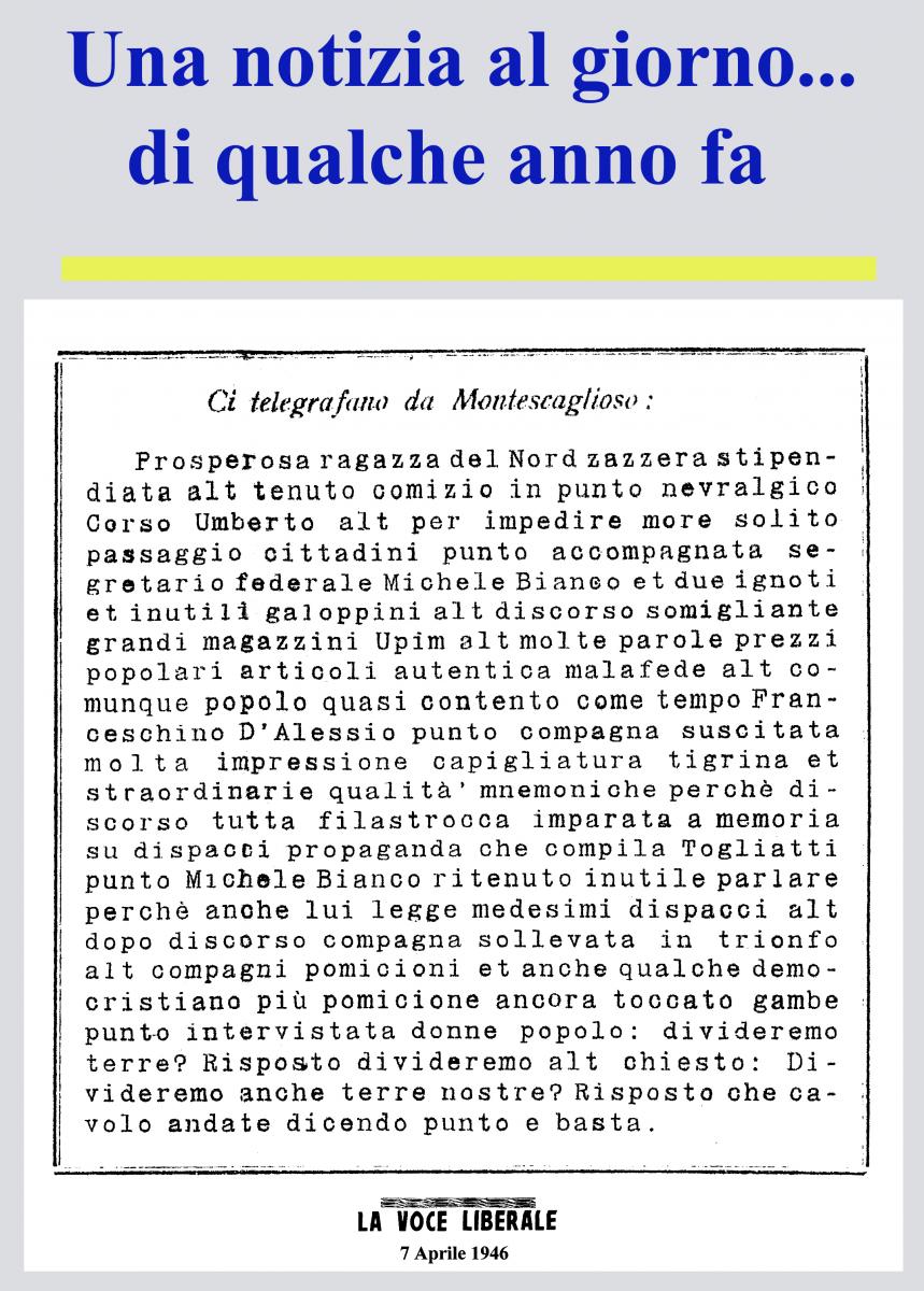 Una infinità di GRAZIE all’estensore di queste autentiche chicche e, come non riconoscere il paziente e certosino impegno di Franco che ha raccolto e ci fa conoscere questi pezzi autentici della nostra storia. Ricordiamo, sopratutto l’autore di questi articoli, A.D., ovvero il maestro Antonio Desiderio, che, con la giusta dose di ironia, a volte quasi goliardica e pungente, ha saputo tramandarci questi spaccati di vita reale.