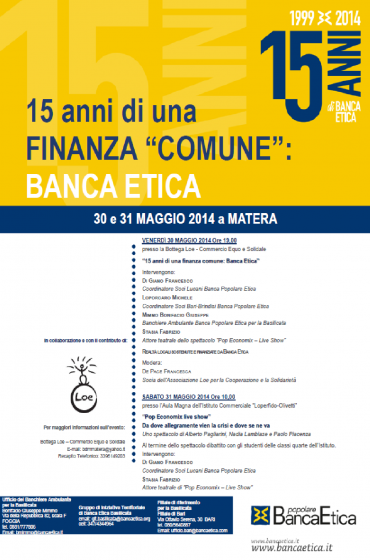 L’Associazione Loe per la Cooperazione e la Solidarietà di Matera invita la cittadinanza ad un incontro dibattito per discutere dei primi 15 anni di attività di Banca Etica.