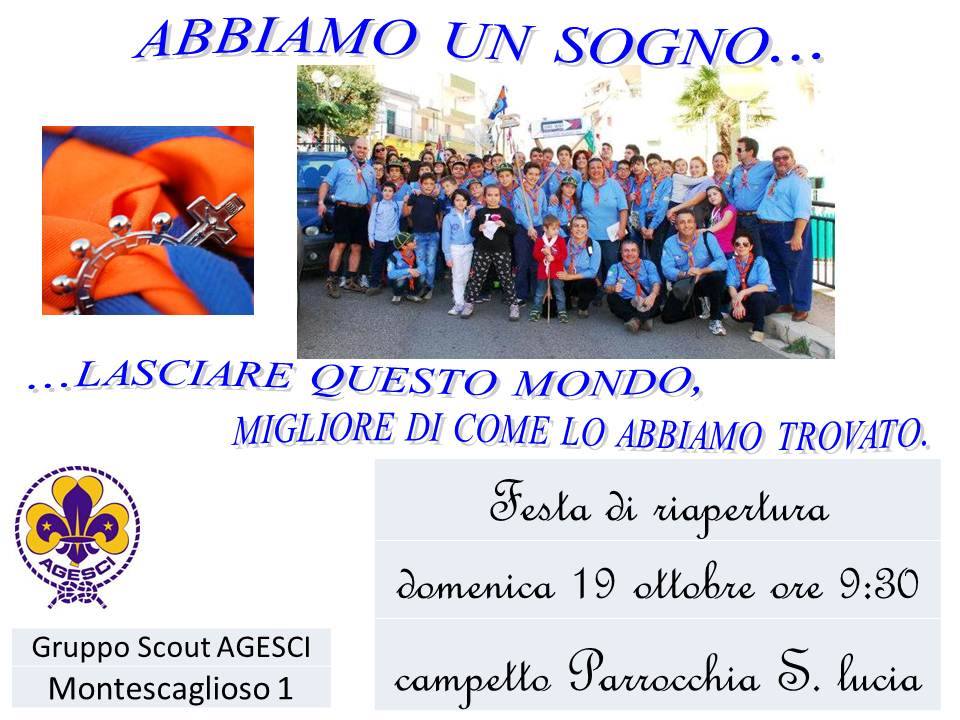 RIASPERTURA GRUPPO SCOUT AGESCI MONTESCAGLIOSO 1 Creato da Cervo Cacciatore Data:09 Ottobre 2014 in: Eventi Lascia un Commento 1336 Visualizzazioni Montescaglioso RIAPERTURA GRUPPO AGESCI MONTESCAGLIOSO 1