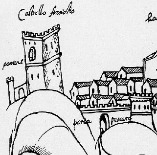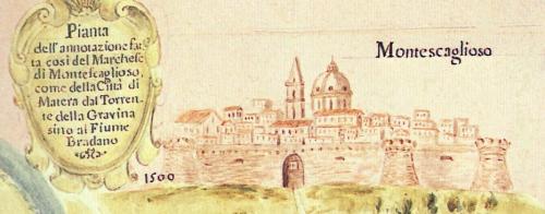 Il borgo longobardo. All’ 893 d.C risale la prima attestazione scritta di un castrum Monticaveosi, ovvero dell’abitato fortificato di Montescaglioso. All’anno 1003 la notizia dell’ assedio saraceno al paese rimasto inespugnato grazie alle proprie fortificazioni. Nell’altomedioevo l’abitato fortificato con al centro una fortificazione longobarda, è limitato al rione Torre Vetere, cioè alla parte più alta della più vasta città greca ormai in buona parte abbandonata. Il castello longobardo è documentato in vedute del 1593 e del 1702. Gli ultimi resti saranno demoliti con la costruzione del serbatoio idrico dell’Acquedotto pugliese. Ancora oggi è possibile notare lo sviluppo concentrico delle strade di Torre Vetere intorno al punto nel quale sorgeva il fortilizio longobardo. Dal sec. XI, dopo l’ampliamento delle fortificazioni e la costruzione di un nuovo castello, il fortilizio longobardo, ha il ruolo di controllo e difesa del versante nordoccidentale del paese, affacciato verso la valle del Bradano.
