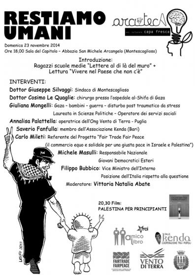 L’evento si svolgerà presso la Sala del Capitolo dell’Abbazia di San Michele Arcangelo e verrà introdotto alle ore 18,00 dai ragazzi delle classi terze medie dell’Istituto Comprensivo “Salinari-Palazzo” i quali illustreranno in breve il progetto “Restiamo Umani. La cooperazione come alternativa al conflitto israelo-palestinese” svoltosi dal 20 al 29 ottobre grazie alla collaborazione tra le due associazioni, i ragazzi ed i docenti dell’Istituto.
