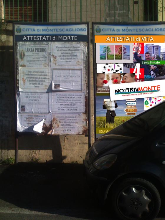 PROPOSTA: L’informazione capillare, la circolazione delle informazioni fra cittadini, nel nostro piccolo villaggio avviene attraverso gli spazi per le PUBBLICHE AFFISSIONI. Io propongo la realizzazione di un progetto che preveda una BACHECA ad USO GRATUITO (esonerata da TASSE COMUNALI) da affiancare a quella degli Annunci di MORTE. (Ovviamente a disposizione di tutte le associazioni culturali che propongono VITA) > Più o meno l’effetto sarebbe questo!