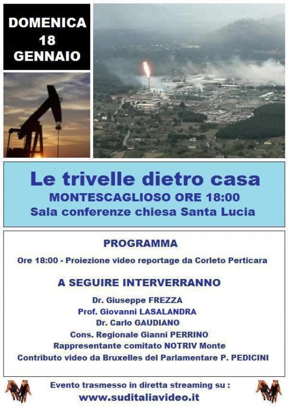 Il gruppo locale montesi 5 stelle, ringrazia tutti i presenti all’incontro che si e’ tenuto a Montescaglioso domenica 18 gennaio dove si e’ parlato di petrolio e rischi derivanti, ringrazia i relatori, le forze politiche, i Carabinieri che hanno garantito l’ordine pubblico, la moderatrice Anna Maria Ricciardi, Don Domenico per la disponibilita’ della sala, Franco Lomonaco che ha messo a disposizione il video proiettore e tutti gli amici pentastellati arrivati da Corleto Perticara, Rionero, Grassano, Miglionico, Bernalda, Policoro, Metaponto, Pomarico, Potenza e Matera. Ci scusiamo per la diretta streaming che non e’ andata in onda a causa di un problema con il server di collegamento e se involontariamente abbiamo dimenticato qualcuno. Vi informiamo infine che grazie alla disponibilità di Giuseppe Disabato è possibile rivedere l’evento registrato sul sito http://www.suditaliavideo.it