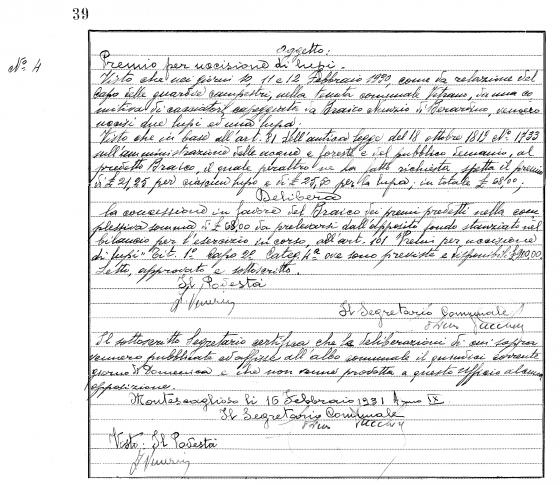 Visto che nei giorni 10, 11 e 12 Febbraio 1930, come da relazione del Capo delle guardie campestri, nella tenuta comunale Vetrano, da una comitiva di cacciatori, capeggiata da Braico Nunzio di Berardino, vennero uccisi due lupi e una lupa;