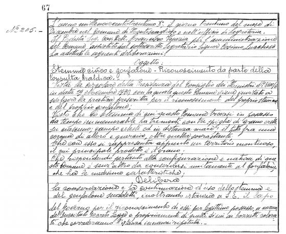 Vista la circolare della Presidenza del Consiglio dei Ministri N° 8600/6 in data 29 Novembre 1930, con la quale questo Comune viene invitato a svolgere la pratica prescritta per il riconoscimento del proprio stemma e del proprio gonfalone;