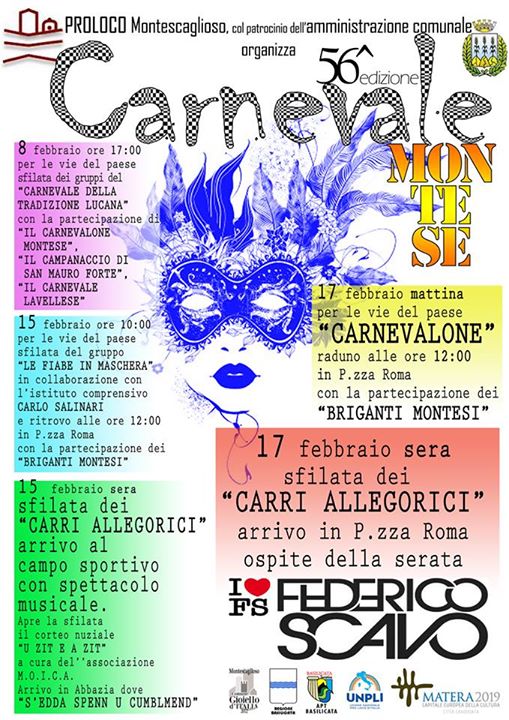 La Pro Loco di Montescaglioso, allo scopo di promuovere le attività turistiche e l’immagine della città montese, nel quadro della nomina di Matera Capitale europea della Cultura 2019, invita i cittadini a partecipare attivamente alla sfilata del Carnevalone. Le iscrizioni saranno raccolte presso la sede ubicata in Piazza S. Giovanni Battista 15, dalle ore 18 alle ore 20, sino a sabato 14 febbraio prossimo.