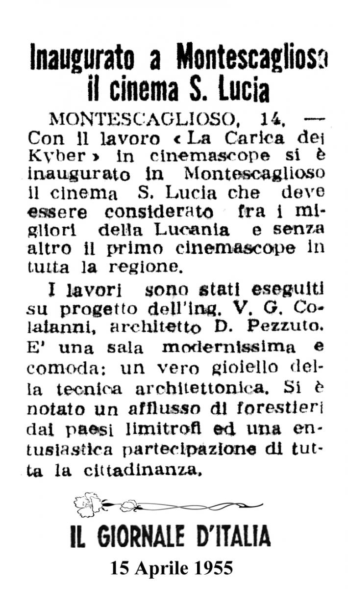 1955: Inaugurazione del cinema Santalucia Creato da Franco Mazzoccoli Data:25 Febbraio 2015 in: Senza categoria Lascia un Commento 1456 Visualizzazioni