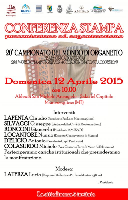 Conferenza Stampa ,20° Campionato del Mondo di Organetto Creato da PRO LOCO Data:08 Aprile 2015 in: Eventi Lascia un Commento 923 Visualizzazioni Montescaglioso Abbazia sala del Capitolo.