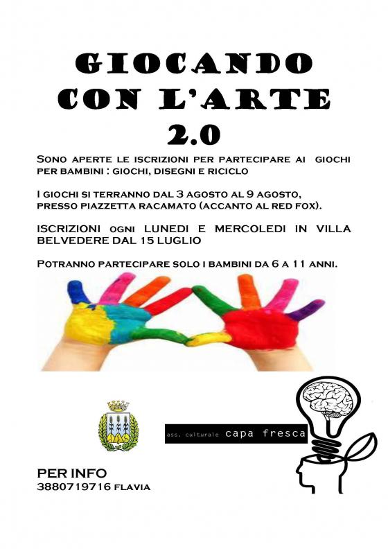 L’associazione CapaFresca ripropone l’iniziativa Giocando con l’Arte come la passata edizione nei primi giorni di agosto dedicandosi ai vostri bambini per sette giorni intensi, l’iniziativa avverrà dal 3 all’11 agosto presso la piazzetta Racamato ( Res Fox ) e la fascia di età consigliabile per i bimbi è tra i sei e gli undici anni