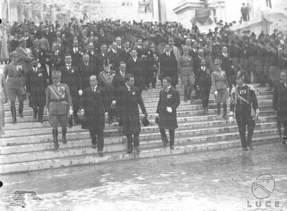 I rappresentanti del Governo si trattengono in ginocchio qualche istante, quindi l’onorevole Mussolini, seguito dagli altri, ministri e sottosegretari, lascia il monumento tra le entusiastiche acclamazioni della folla.[4]