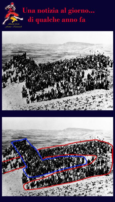 Mi ricordo ai “Tre Confini”, alle “Chianedd”e alle “Murge”, nelle terre di don Guglielmo Strada. Quanto lavoro fu fatto là! In tre, quattro giorni arammo tutta l’azienda di quello, si può dire, con queste bestie. Alle “Chianedd”, a quelle di Galante. Ma ai “Tre Confini” fu proprio una cosa particolare. Venivano i poveretti con questi asini “menz’ scadut'”. Chi te lo avrebbe dato allora? Non è come adesso che si butta tanta merce! E si facevano dare un po’ di biada in prestito, i poveretti, da qualche altro: “Uè ch’egghia v’nì pur j’ a arà, damm’ na picch’ ca edda mangià u ciucc’ o u mul'”. Appena iniziava ad arare, “s’app’zzav’ n’ picch’, stu ciucc’ d’ frastagh’, s’ d’cev’ na vold'” ed andava per terra. Vorrei che ci fossero le fotografie! Tutti a tirarlo per la coda per alzarlo, noi giovani allora, avevamo la forza, no?, nonostante eravamo mezzi digiuni, ma sempre ventuno, ventidue anni avevamo, no? E mi ricordo quel giorno stesso, per terra, così, facemmo una stella con falce e martello tutta di persone, tutta di giovani.