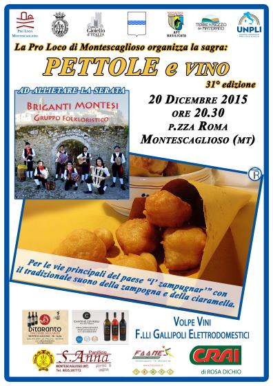 Domenica 20 dicembre, a partire dalle ore del tardo pomeriggio, presso gli appositi stand allestiti per le strade del Centro storico e nella centrale Piazza Roma, sarà riproposta la Sagra delle Pettole, tradizionale appuntamento natalizio organizzato dall’Associazione di promozione turistica Pro Loco di Montescaglioso con il patrocinio dell’Amministrazione Comunale di Montescaglioso – Comune gioiello d’Italia 2012. La manifestazione, giunta alla XXXI edizione, è da sempre uno degli appuntamenti principali del periodo natalizio, durante il quale, oltre ad occasione di incontro tra le famiglie, é possibile degustare le dorate frittelle di pasta lievitata fritta in olio di oliva novello, consumata con un buon bicchiere di vino rosso. Si tratta, infatti, di uno dei prodotti più apprezzati della tradizione natalizia, da consumare sia nella versione dolce che salata.