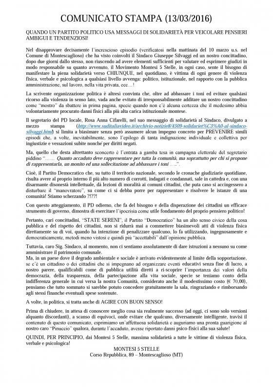 COMUNICATO STAMPA Creato da M5S Data:13 Marzo 2016 in: Politica Lascia un Commento 1023 Visualizzazioni