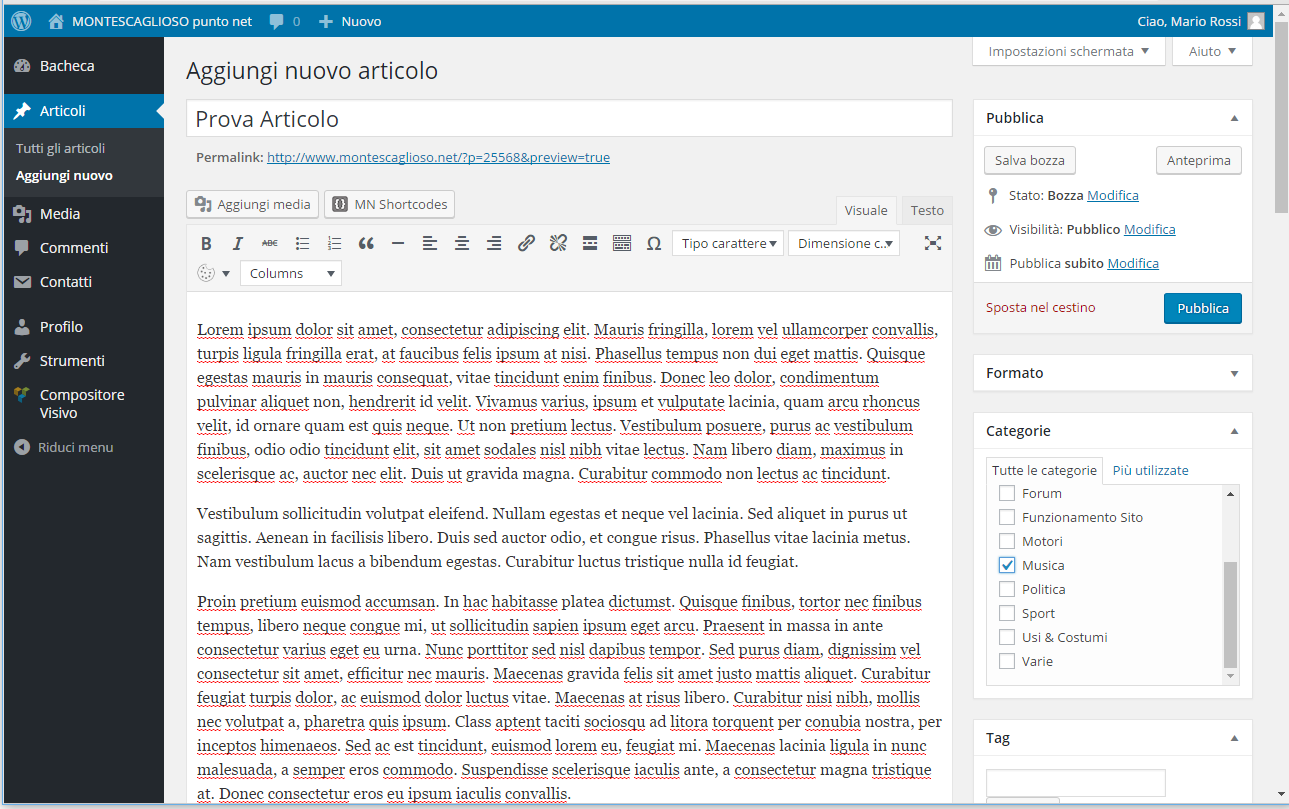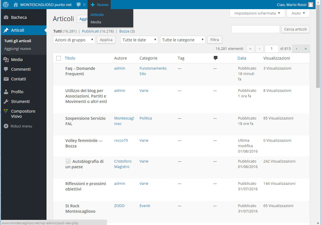 - Come inserisco un nuovo articolo? Cliccate sul +Nuovo in alto, inserire titolo, testo ed una categoria appropriata all’argomento e cliccare su Pubblica