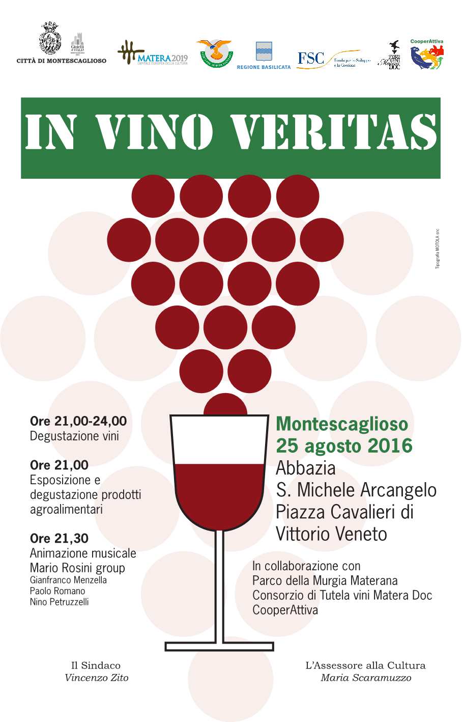 “In Vino Veritas”. L’importante iniziativa, organizzata dall’Amministrazione Comunale di Montescaglioso e curata dall’assessore alla Cultura ed Integrazione Circuito Matera 2019, dott.ssa Maria Scaramuzzo in collaborazione con il Parco della Murgia Materana e il Consorzio di Tutela vini Matera Doc, si arricchisce quest’anno di un percorso degustativo dei prodotti tipici della Basilicata, accompagnato dai migliori vini lucani, pugliesi e calabresi. L’evento era stato programmato per l’11 agosto ma a causa della pioggia era stato rinviato a giovedì 25. La serata che inizierà alle 21:00 sarà animata dalla musica del noto cantante e musicista Mario Rosini voce e piano, da Gianfranco Menzella al sax, da Paolo Romano al basso elettrico e da Marco Paterno alla batteria.