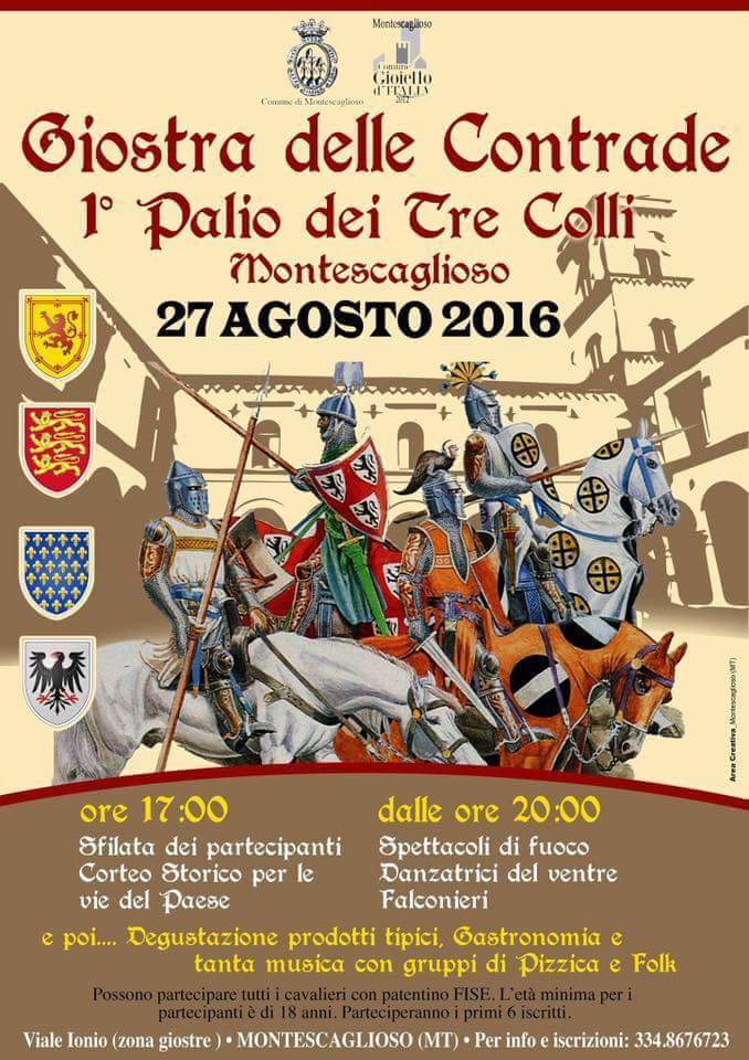 Nel pomeriggio accurate vestizioni e sorprendenti spettacoli d’intrattenimento di giullari, falconieri, sbandieratori e danzatrici del ventre, introdurranno l’accurato 1° Palio dei Tre Colli.