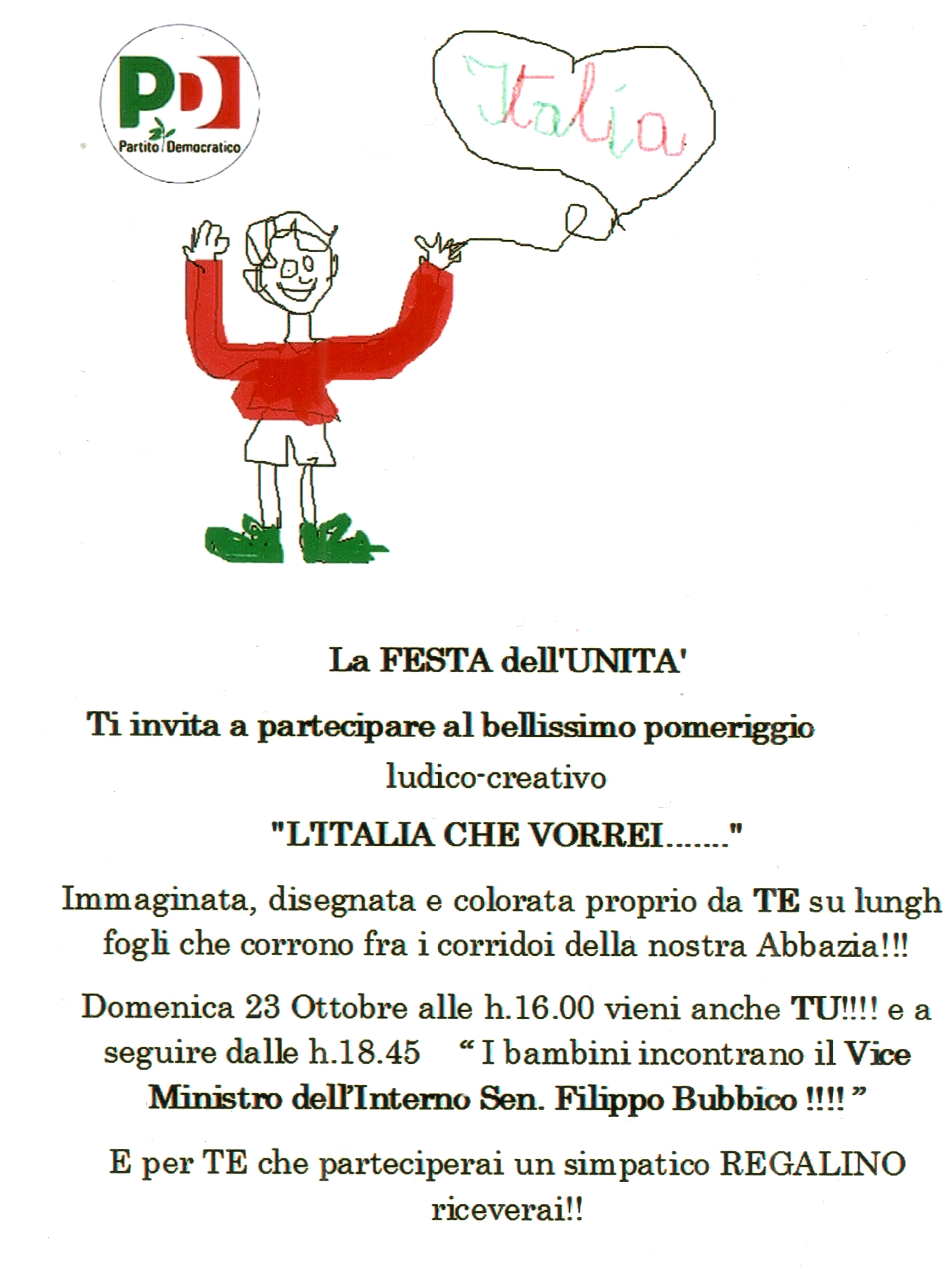 La domenica del 23 ottobre ore 16 uno spazio lucico-creativo dedicato ai Bambini con Annalisa Affortunato L’italia che vorrei immaginata,disegnata e colorata su lunghi fogli che corrono fra i corridoi della nostra Abbazia, a seguire i bmbini incontreranno il Vice Ministro dell’Interno Sen Filippo Bubbico per un confronto sull’italia che vorrei