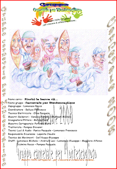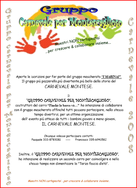 ebbene che tu faccia il tifo per i ragazzi che fanno la cartapesta che hanno onore e merito ma ti prego di non dire che a montescaglioso c’è un gruppo che ha molti soldi e che si può permettere tutto , sicuramente aspiriamo a fare bella figura è forse una colpa ? oppure ci vuoi escludere dal carnevale 2008. caro rokko77 tra qualche giorno saranno affissi dei manifesti del nostro gruppo vatti a leggere le persone che ne fanno parte ,ci sono commercianti, trasportatori, operai,studenti ,disoccupati , tutta gente che non naviga nell’oro ma che si e autotassata non di migliaia di euro ma di circa 200 euro a testa con enormi sacrifici per acquistare i pupazzi e fardivertire la gente mettendoci volontà e inpegno esattamente come tutti gli altri che si adoperano per il carnevale montese