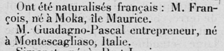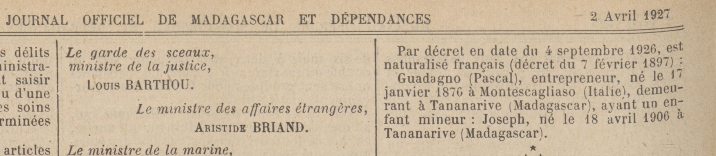 Ecco ad esempio dove era andato a finire nei primi del Novecento, Pasquale Guadagno, un imprenditore montese che nell’aprile del 1927 viene naturalizzato cittadino del Madagascar dove aveva generato un figlio, Giuseppe, nato a Tananarive nel 1906. Il che significa che vi risiedeva da oltre venti anni insieme alla famiglia e che, presumibilmente, aveva sposato una donna del luogo dal momento che mancano riferimenti all’analogo atto nei confronti di costei.