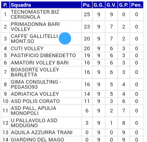Battuta d’arresto per il Caffè Gallitelli Montescaglioso. Dopo sette vittorie consecutive, il sestetto montese conosce il sapore della sconfitta (la seconda stagionale) sul parquet del Primadonna Bari, seconda in classifica, nel primo vero scontro diretto del torneo. Le ragazze allenate da Dino Esposito hanno ceduto Con il punteggio di 3-0, al termine di tre parziali molto tirati e terminati 29-27,25-22 e 25-19.