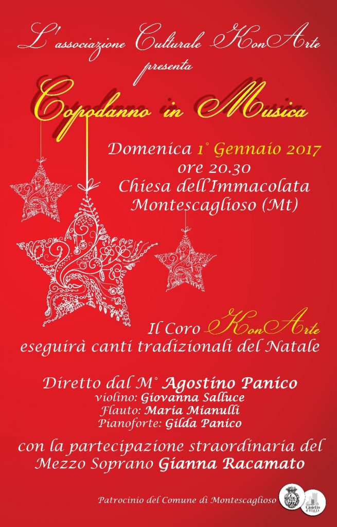 Domenica 1° gennaio 2017, alle ore 20.30, presso la Chiesa dell’Immacolata, il coro della neocostituita Ass. Culturale KonArte, diretto dal M° Agostino Panico, presenta “Capodanno in Musica”, evento patrocinato dal Comune di Montescaglioso (MT).
