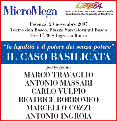 Durante l’incontro, dal titolo “La legalità è il potere dei senza potere” – IL CASO BASILICATA che si terrà Venerdì 23 Novembre alle ore 17.30, presso il teatro Don Bosco di Potenza, sarà presentato il nuovo numero di MicroMega – 6/07, al quale hanno collaborato nomi del calibro di Gherardo Colombo, Andrea Camilleri, Carlo Lucarelli, Margherita Hack, Furio Colombo, Sabina Guzzanti, Marco Travaglio, Salvatore Borsellino e Luigi De Magistris, oltre a don Marcello Cozzi.