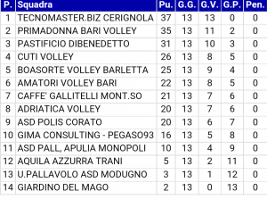 L’occasione per il riscatto per le pallavoliste biancazzurre sara’ comunque immediata considerato che sabato prossimo si tornera’ a giocare tra le mura amiche del PalaWojtyla per la prima giornata di ritorno con il Molfetta, squadra che insegue in decima posizione in classifica a cinque lunghezze e che appare sulla carta alla portata. Servira’ pero’ una prestazione autoritaria e di ben altro spessore rispetto a quelle delle ultime uscite.