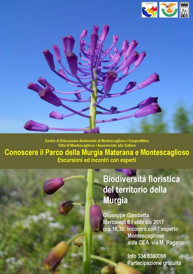 Nel quadro del programma ” Conoscere il Parco della Murgia Materana e Montescaglioso: escursioni ed incontri con esperti “, mercoledì 8 Febbraio 2017 alle ore 18:30 si terrà a Montescaglioso, nell’aula del Centro di Educazione Ambientale, in via Mario Pagano n. 1, Convento della SS. Concezione) un incontro con lo studioso Giuseppe Gambetta, tra i maggiori esperti della biodiversità dei territori della Murgia. Sarà illustrata l’ampia biodiversità floristica dei territori di Matera e Montescaglioso con riferimento anche agli usi delle piante nella tradizione popolare. La partecipazione è libera e gratuita.