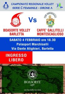 Riprende da Barletta sabato 4 febbraio alle ore 18,30 la marcia della squadra montese che gioca contro la squadra locale una gara valevole per la seconda giornata di ritorno del girone A della serie C femminile. Il team montese ci arriva con 24 punti in classifica, 8 vittorie, 6 sconfitte.La squadra pugliese conta 28 lunghezze in graduatoria frutto di 10 partite vinte e 4 perse. Una squadra, quella del Barletta che staziona in quarta posizione. All’andata il Caffe’ Gallitelli si impose per 3-0 .