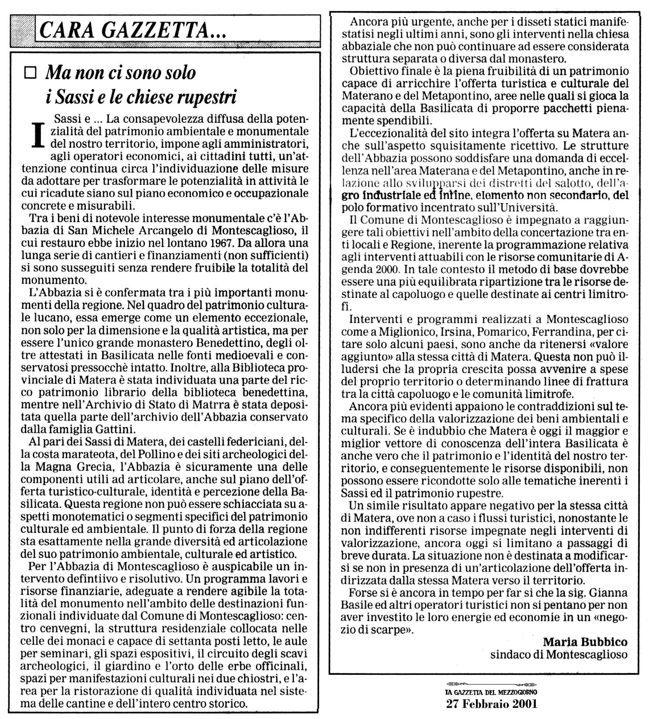 Un lucido, intelligente e preveggente, anche se con modalità e priorità differenti, intervento dell’allora sindaco di Montescaglioso, Maria Bubbico,su La Gazzetta del Mezzogiorno nel lontano febbraio del 2001
