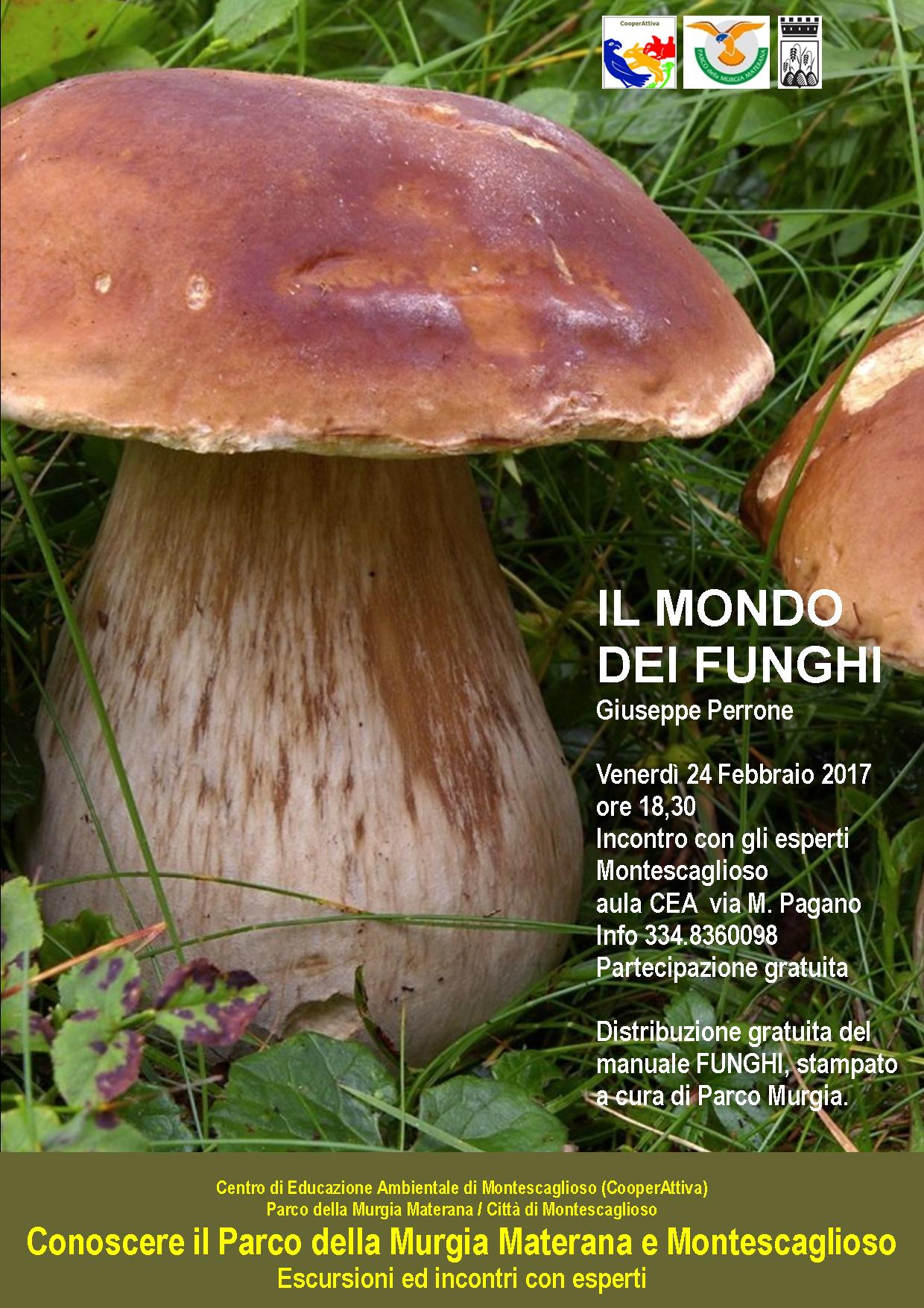 Nel quadro del programma ” Conoscere il Parco della Murgia Materana e Montescaglioso: escursioni ed incontri con esperti “, venerdì 24 Febbraio 2017 alle ore 18:30 si terrà a Montescaglioso, nell’aula del Centro di Educazione Ambientale, in via Mario Pagano n. 1, Convento della SS. Concezione, un incontro l’esperto Giuseppe Perrone sul tema i FUNGHI. Si presentano le specie del territorio di Parco Murgia e del Parco di Gallipoli – Cognato. Per l’occasione sarà distribuito il manualetto FUNGHI prodotto dal Parco della Murgia Materana.